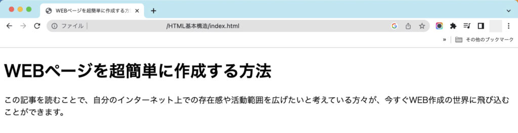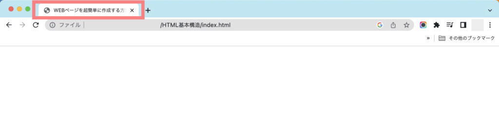 <title>タグを使用して「WEBページを超簡単に作成する方法」とWEBページにタイトルをつけています。<title>タグについて詳しく知りたい方は以下の記事を参考にしてみてください。