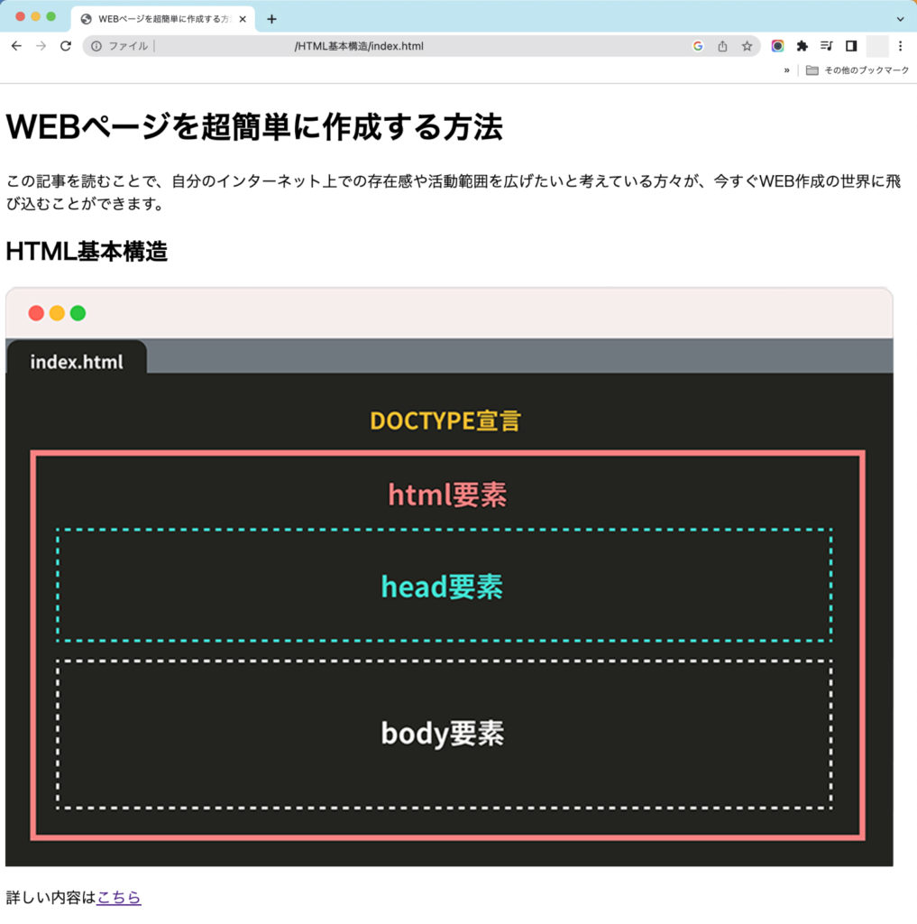 <a>タグを使いリンクを表示した試しに、WEBページ上の<こちら>というテキストをクリックするとHTML基本構造のページに移動したと思います。