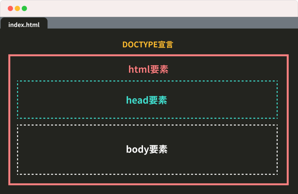 WEBページを表示するために以下のHTMLの基本構造(基本の骨組み)が必要不可欠です。以下のコードは最低限必要なコードのみを記述しています。